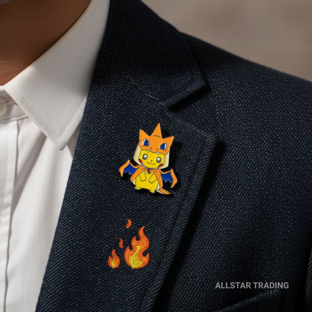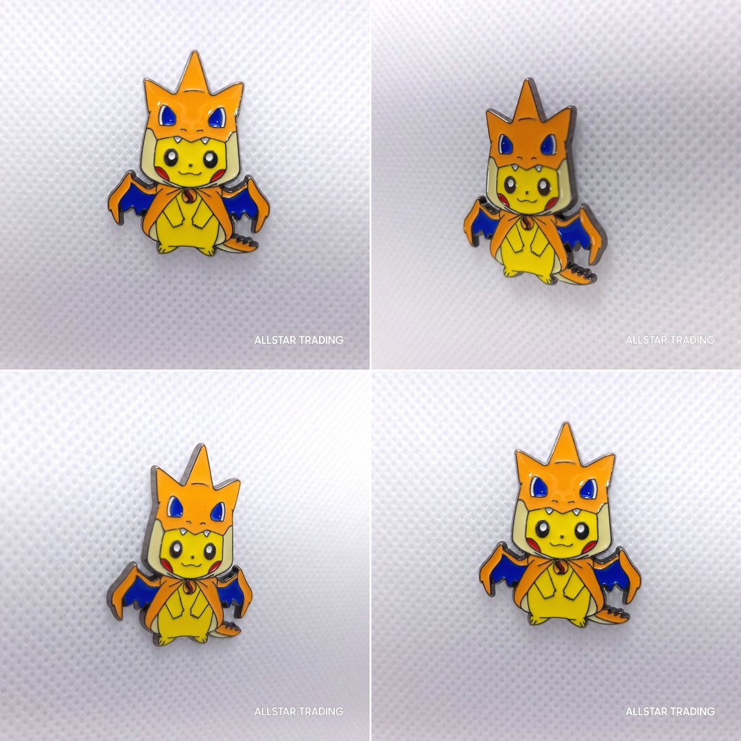 Poncho Pikachu enamel pin featuring Pikachu wearing a Mega Charizard Y poncho. A strong pickup for Pokémon fans, poncho Pikachu collectors, and pin displays. Works well on jackets, bags, hats, lanyards, or display boards.