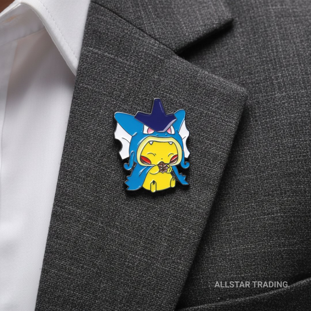 Poncho Pikachu enamel pin featuring Pikachu wearing a Mega Gyarados poncho. A standout piece for Pokémon fans of Mega Gyarados and Poncho Pikachu, pin collectors, and display setups. Great for jackets, bags, hats, lanyards, or pin boards.